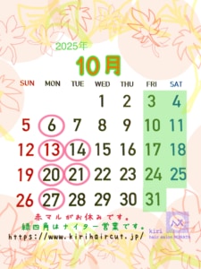 赤丸がお休みです 18〜21の4日間は夏期休暇頂いております